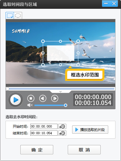 快速去除水印与字幕:点击主界面“叠加素材”左栏“去水印”,点击界面左下角的“添加去水印区域”按钮,在弹出框,用矩形框框选水印和字幕的范围。