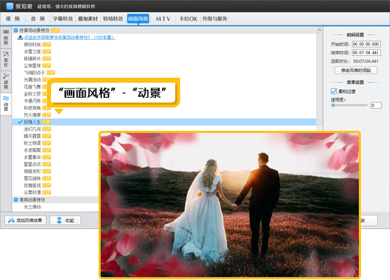添加动态相框可以为视频增添视觉吸引力和趣味性,使视频内容更加丰富和生动。在爱剪辑里面,点击顶部导航条“画面风格”,在左侧栏选择“动景”栏目,我们可以根据主题,给视频应用好莱坞动景特效,实现动态相框的效果。比如:金粉之梦、水墨晕染、玫瑰人生、优雅弧线、水波粼粼、绚丽波形等等。