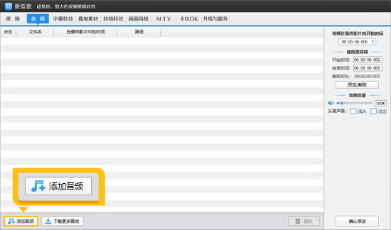 点击顶部导航条的“音频”面板,导入唯美动听的音乐。