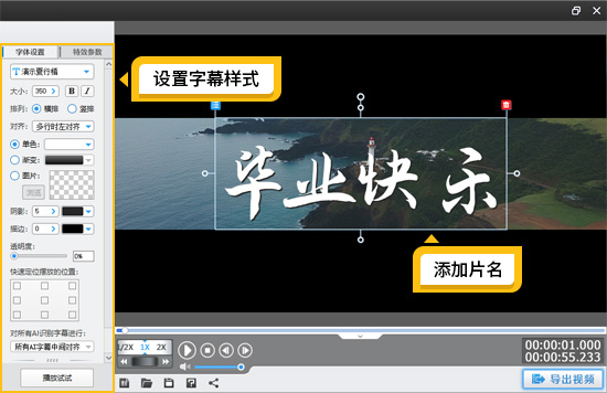 你可以挑选一些校园的空镜头,如天空、树木等,作为片头的背景。然后,在背景上添加文字“我们毕业啦”,颜色选择醒目的黄色,字体大小设置为280,以确保文字在视频中清晰可见。同时,还可以加上班级的小字,以增加视频的归属感。