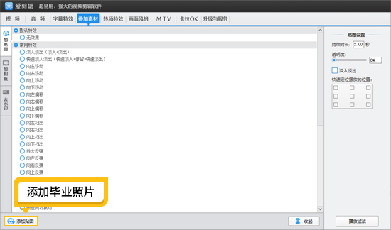毕业照片是记录同学们青春岁月的重要载体。你可以通过爱剪辑的“叠加素材”-“加贴图”功能,将拍摄的毕业照片添加到视频中。在添加照片时,你可以将照片缩小,并将多张照片摆放在视频画面上,以形成一种拼贴的效果。这样不仅可以展示更多照片,还能让视频更加生动有趣。