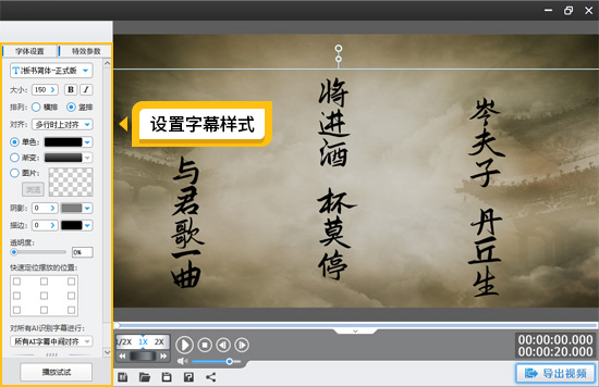 随后,进入“字体设置”的相关区域,着手对字幕样式展开细致设置。挑选一款具有古风韵味的独特字体,将字幕的大小精准设定为150,同时把颜色选定为深邃的黑色,以此来营造出古朴而典雅的视觉效果。