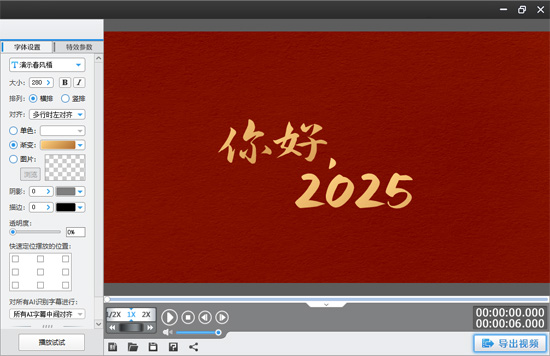 接下来,把操作界面切换至“字幕特效”面板,在视频预览框内双击鼠标左键,此时会弹出字幕输入框,在框内输入醒目的“你好,2025”字样。为了凸显标题的庄重与华丽,将字体大小设置为280,渐变颜色选定为金色,使之熠熠生辉。在特效设置区域,取消对“出现特效”和“消失特效”的勾选,仅在“停留特效”列表中选择“静态展示”这一特效,并将其特效时长精确地设置为6秒,通过这样的设置,让标题能够稳稳地处于画面中心位置,以一种简洁而大气的方式开启新年祝福的篇章。