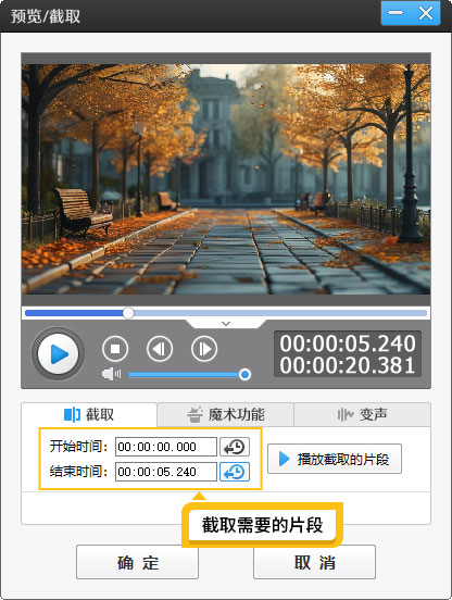 修改截取视频时间段方法一:在“视频”面板的“已添加片段”中双击要修改的视频片段,会弹出“预览/截取”对话框,我们可以对要截取的视频时间段进行修改。图1:双击视频片段缩略图图2:修改截取视频时间段方法二...