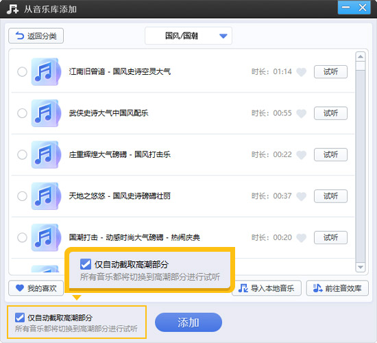 勾选“仅自动截取高潮部分”,让AI自动选取音乐最精彩的部分,提升视频的视听效果。