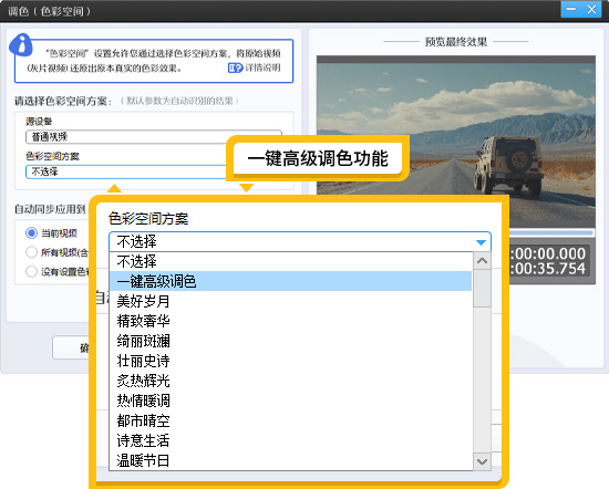 爱剪辑内置上百种电影调色方案,只需一键即可应用,让去除水印后的视频瞬间提升高级感,为视频增添独特魅力。