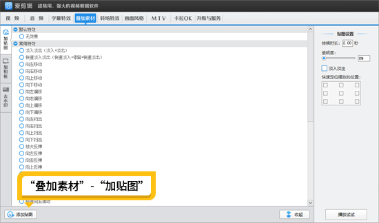 打开爱剪辑,先导入一个软件自带的黑幕视频,并截取所需时长,如6秒。接着,点击“叠加素材”左栏的“加贴图”,将拍摄的照片导入,特效选择无效果,让图片自然融入视频。