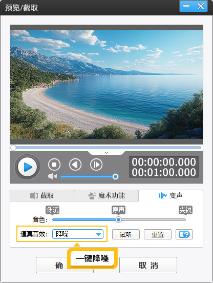 在“变声”面板中,将“逼真音效”选择为“降噪”,爱剪辑就能自动分析视频中的噪音成分,并进行有效去除。这个过程简单快捷,能显著提升声音的纯净度,让视频内容听得更清楚。