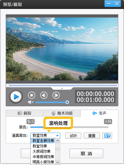 爱剪辑提供丰富的混响场景选择。在“逼真音效”下拉框中,有“大房间”、“中等房间”、“教室”、“教堂”、“走廊”等多种场景选项。根据视频实际所处场景进行选择,软件会自动为声音增加合适的混响效果。比如一段在室内拍摄的对话视频,选择“中房间”场景,声音会瞬间变得更有空间感,听起来柔和且自然,极大提升视频的听觉体验。