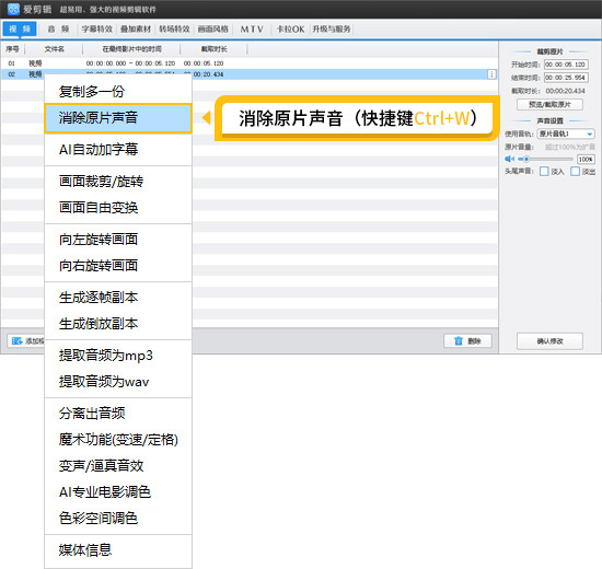 打开爱剪辑软件,在主界面点击“视频”选项卡,通过“添加视频”按钮导入影视素材。接着切换至“音频”面板,点击“添加音频”,将解说配音文件导入软件。如果影视原音与解说冲突,可右键点击视频素材,选择“消除原片声音”,确保解说清晰可闻。